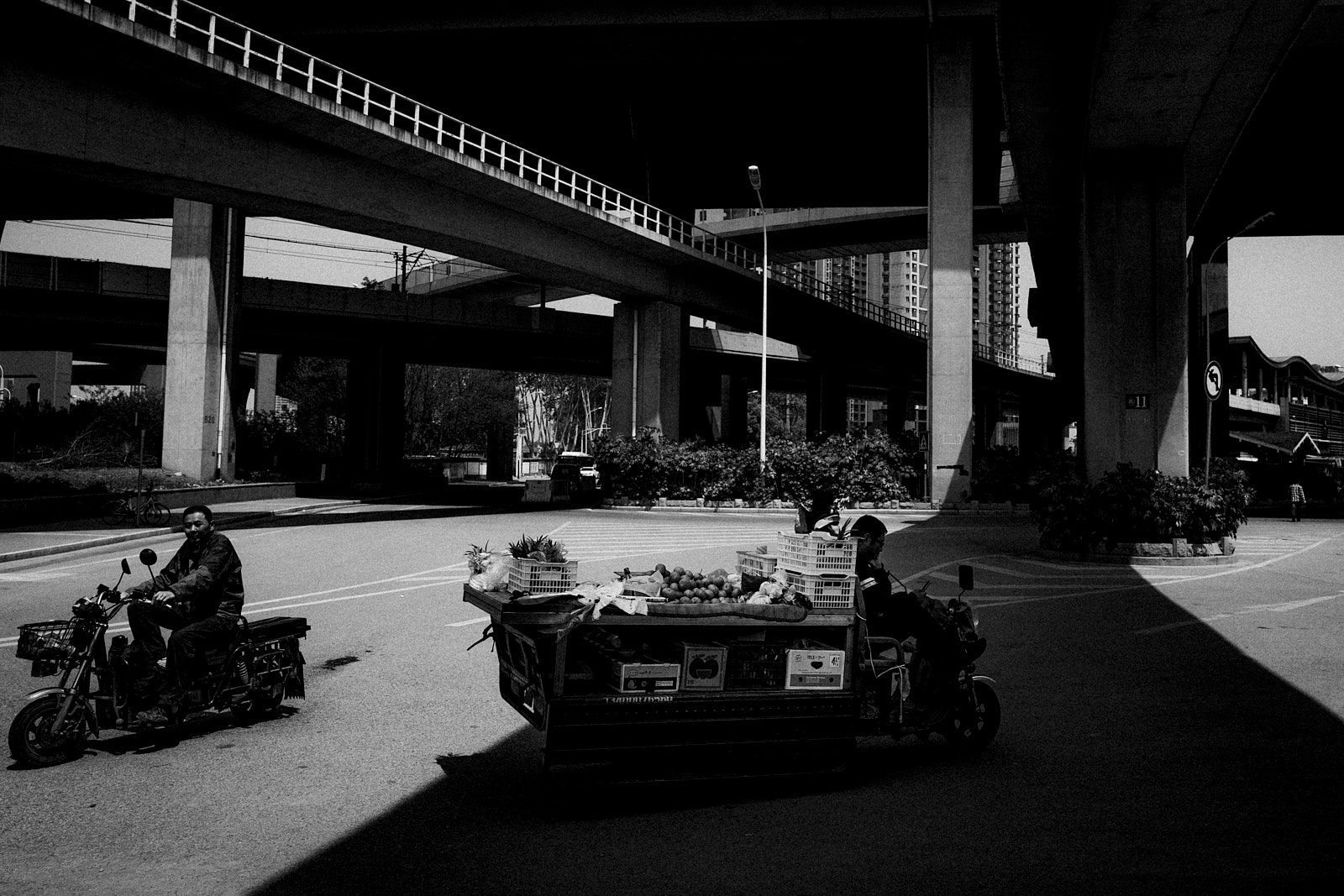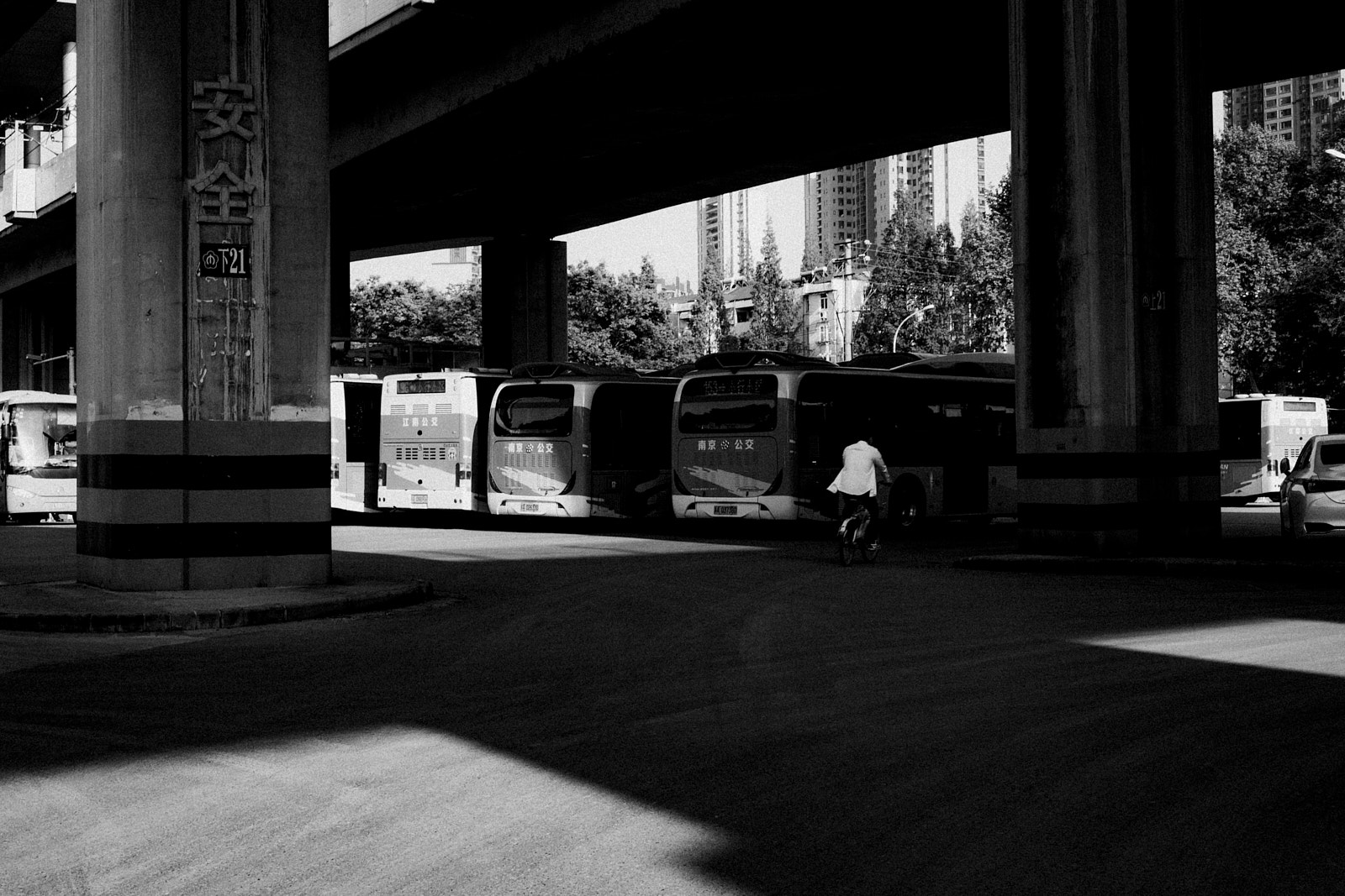 And yet, the 4-season merchant is there when the train’s barriers are lowered, and takes advantage of the forced stop of people to offer its fruits. Further on, the bus driver has parked his vehicle in the terminal parking lot and his working day is over. These two workers, who are derisory in terms of the huge flow of passers-by, suddenly give a different meaning to this space because it becomes their place of work.